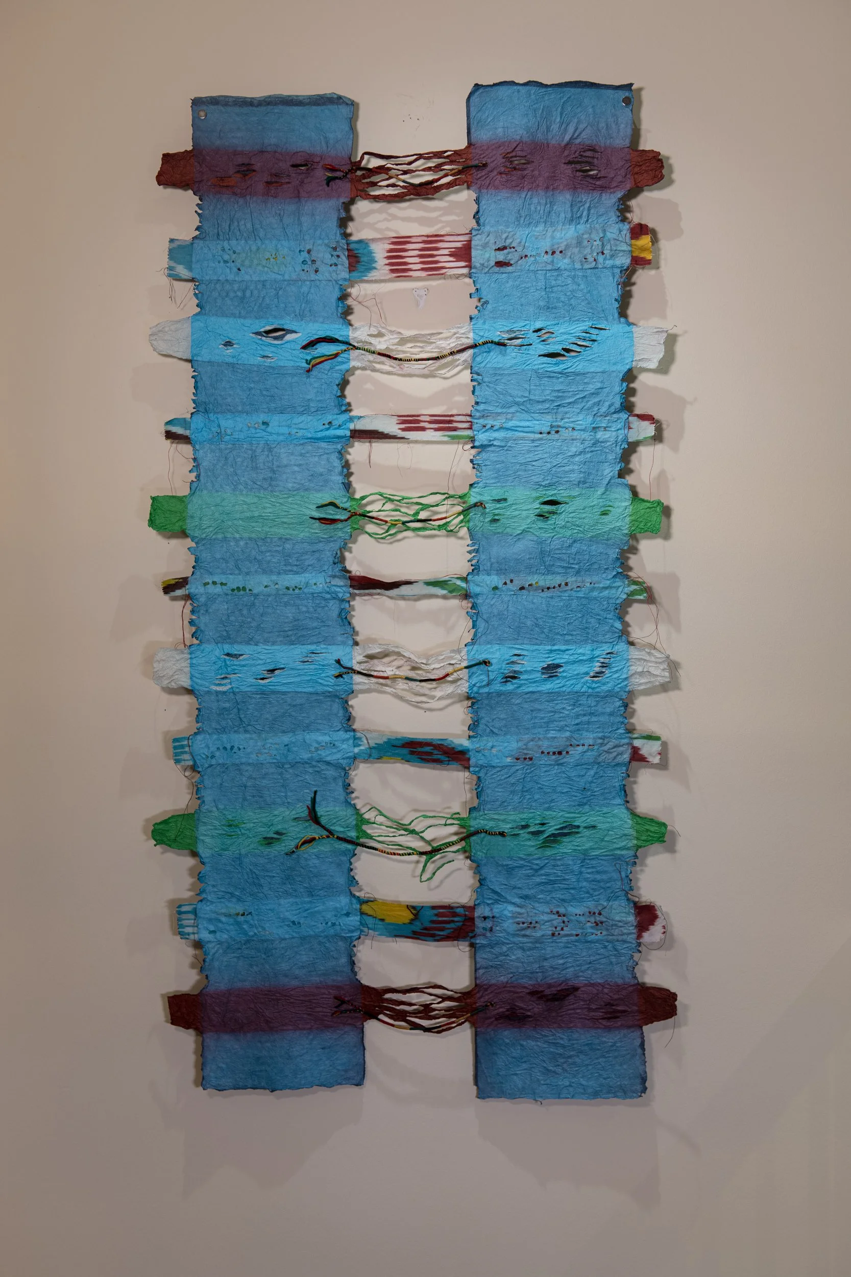 Mulberry paper, Uzbek ikat fabric, braided Bhutan tassels, thread. 27x52x2 in, 2024